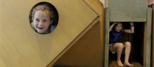 Sie trainieren ihr Gleichgewicht auf unserer Slackline, klettern an unserer Boulderwand und erkunden kriechend das Gängesystem unserer Speleobox.