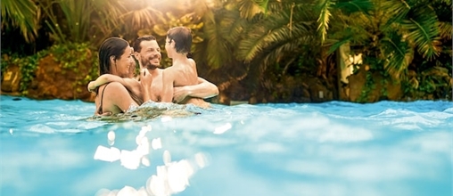 Im Schnorchelbecken neben dem Wellenbecken können Sie zwischen Palmen und Felsen entspannen. Es ist wie in einem tropischen Paradies.