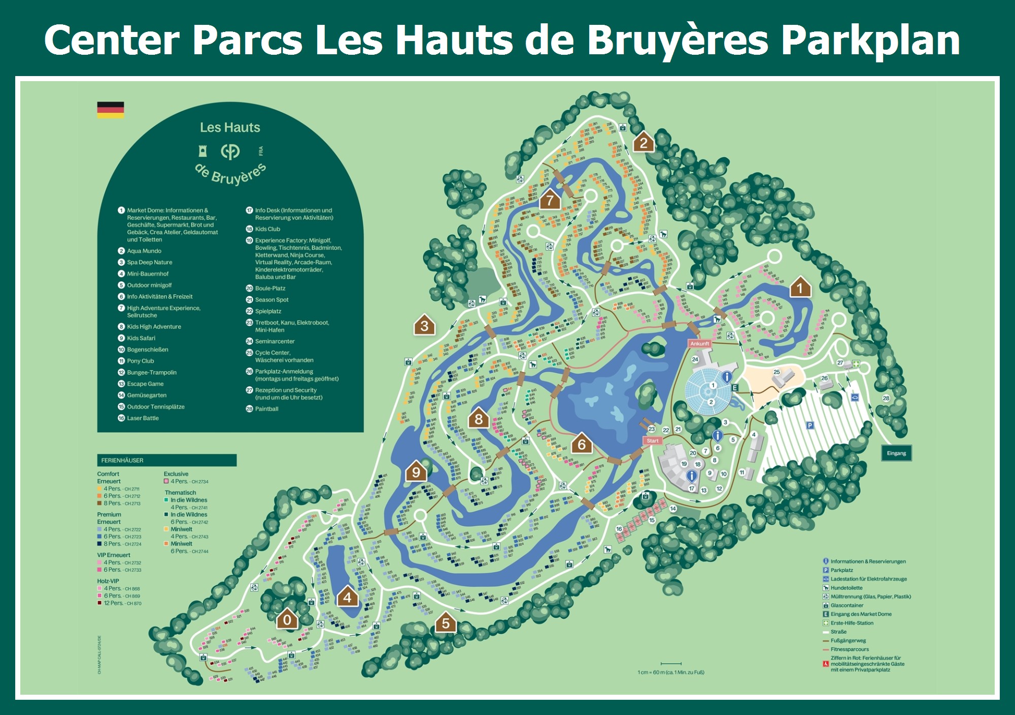 Aktueller und übersichtlicher Parkplan von Center Parcs Les Hauts de Bruyères mit alle Unterkünfte und Einrichtungen, auch als PDF herunterladbar.