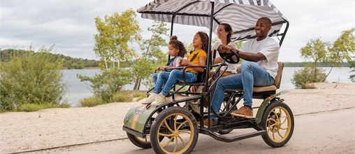 Mach dich bereit für eine unterhaltsame und sportliche Fahrt in unseren Boliden im Safari-Stil! Es gibt Platz für bis zu 3 Erwachsene und 2 Kinder bis zu 4 Jahren. Sie zahlen pro Family Bike und nicht pro Person.