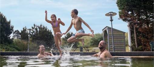 Nehmen Sie ein Bad im Freibad. Im Sommer können Sie die Sonne genießen und sich auf der Wiese bräunen.