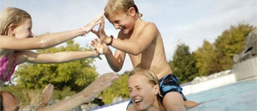 Nehmen Sie ein Bad im Freibad. Im Sommer können Sie die Sonne genießen und sich auf der Wiese bräunen.